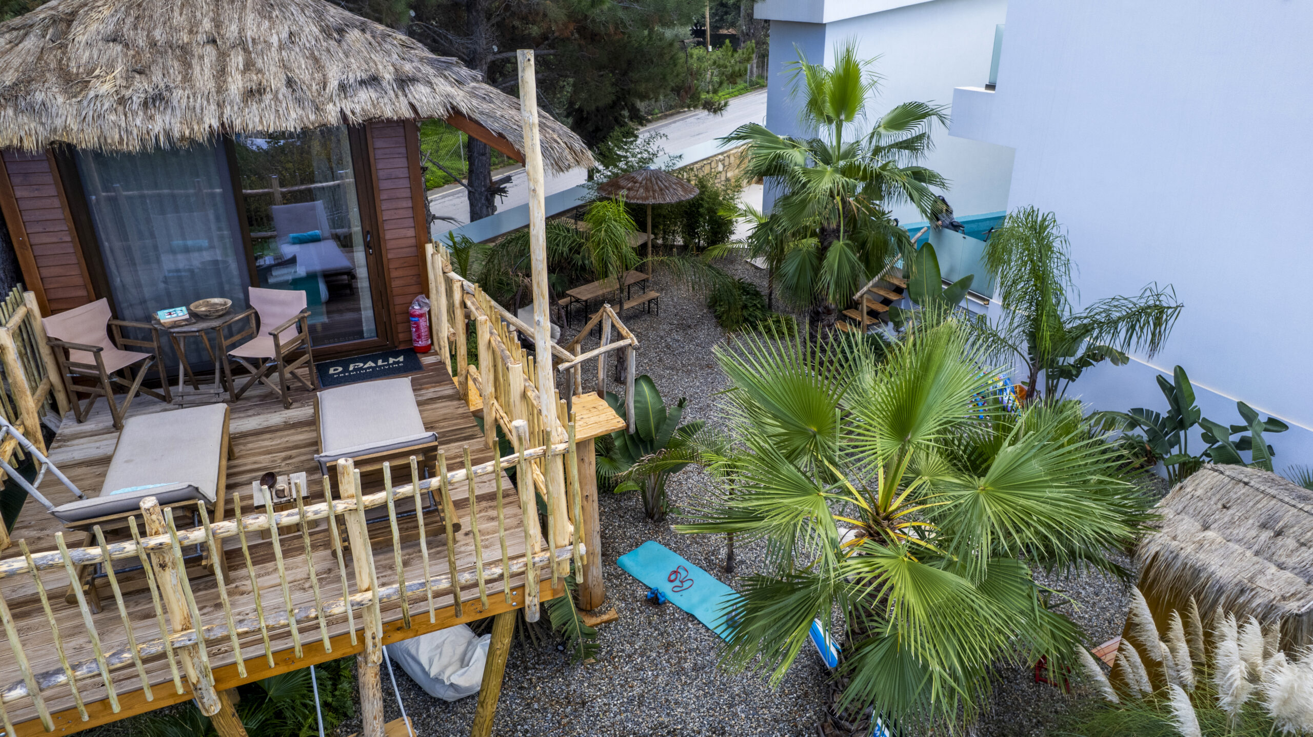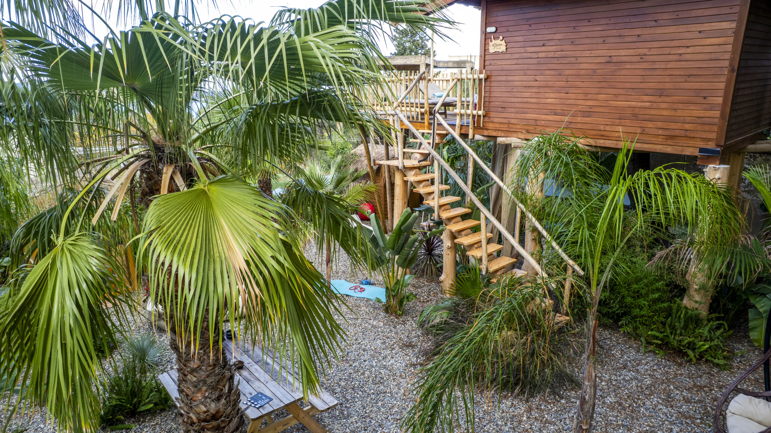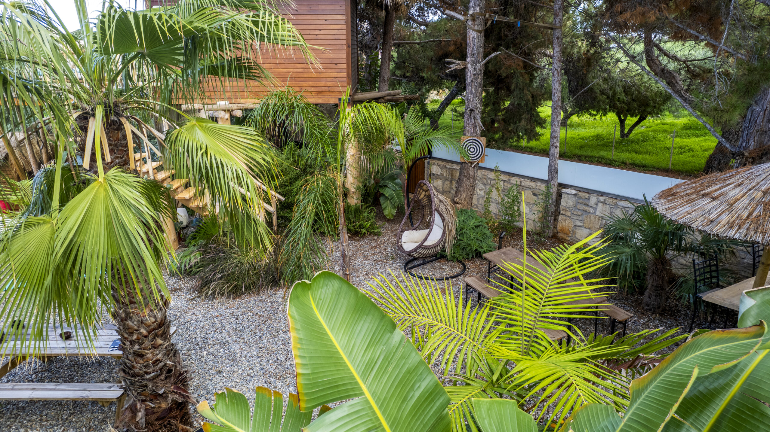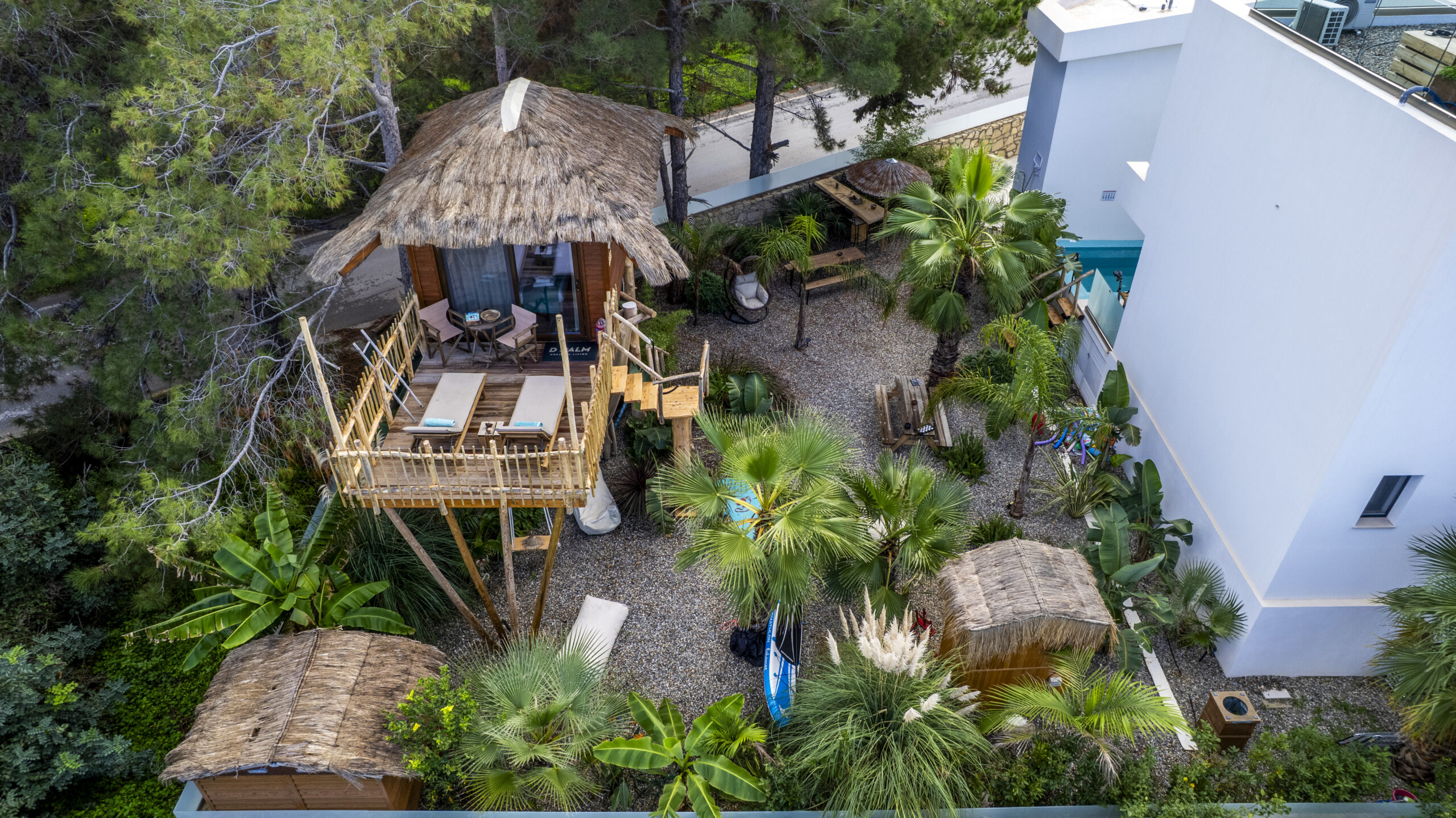 The Dream Tree Villa exterior is a stunning blend of rustic charm and modern elegance, seamlessly integrated into the natural landscape. Nestled high among sturdy trees, the reclaimed wood structure offers timeless beauty and eco-friendly appeal. A spacious wraparound deck encircles the treehouse, providing ample space to relax and enjoy breathtaking views of the surrounding forest and distant sea. Comfortable outdoor furniture, including lounge chairs and a cozy hammock, invites guests to unwind and immerse themselves in nature. Strategically placed solar-powered lanterns illuminate the deck at night, creating a magical ambiance. But the harmony with nature extends beyond the treehouse itself. Nestled beneath, a luxurious jacuzzi awaits, offering a truly unique experience of relaxation. Imagine soaking in the warm water, enveloped by the sights and sounds of the forest, for an unparalleled moment of tranquility. The treehouse exterior remains both a testament to sustainable design and a serene, inviting retreat, perfect for those seeking a unique connection with nature and a touch of indulgent rejuvenation.